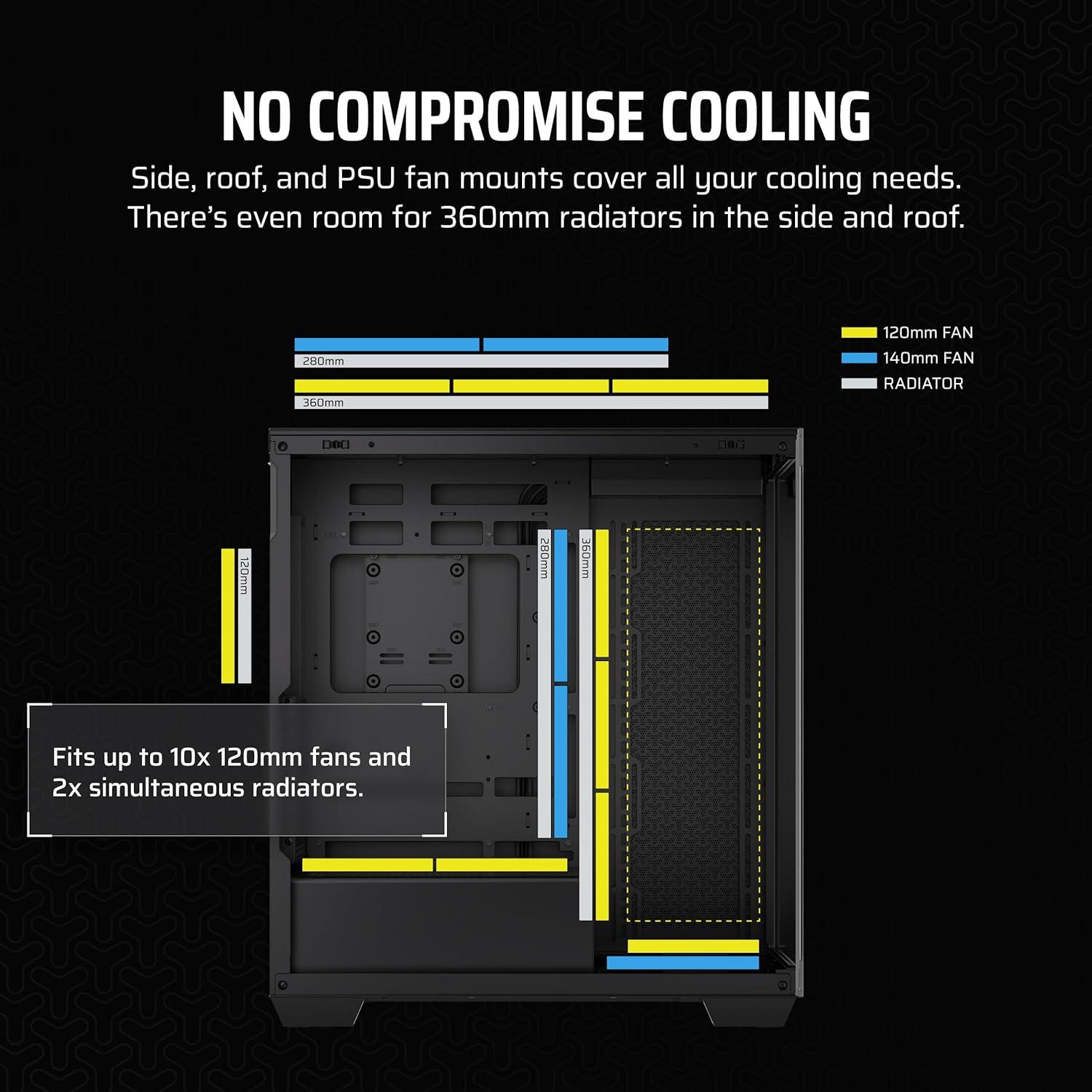 High Cooling Capacity: Side, roof, and PSU fan mounting points, accommodating up to 10x 120mm fans, ensure that you don’t sacrifice cooling for the stunning looks of a glass front panel.
