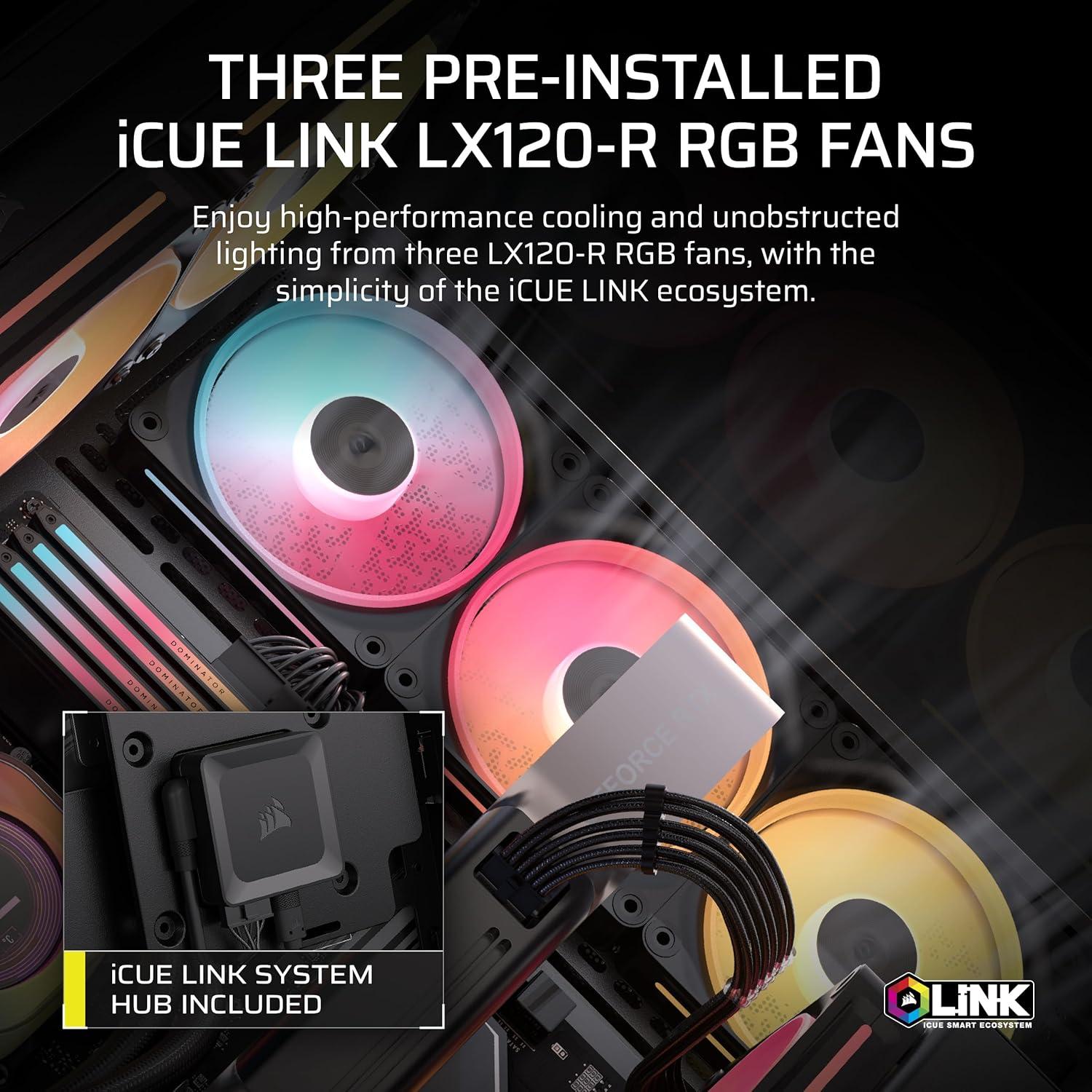 iCUE LINK Fans and System Hub – Three pre-installed LX120-R reverse rotor RGB fans and an iCUE LINK System Hub bring you into the iCUE LINK ecosystem, featuring simplified connections and reduced cabling for a clean, streamlined build.
