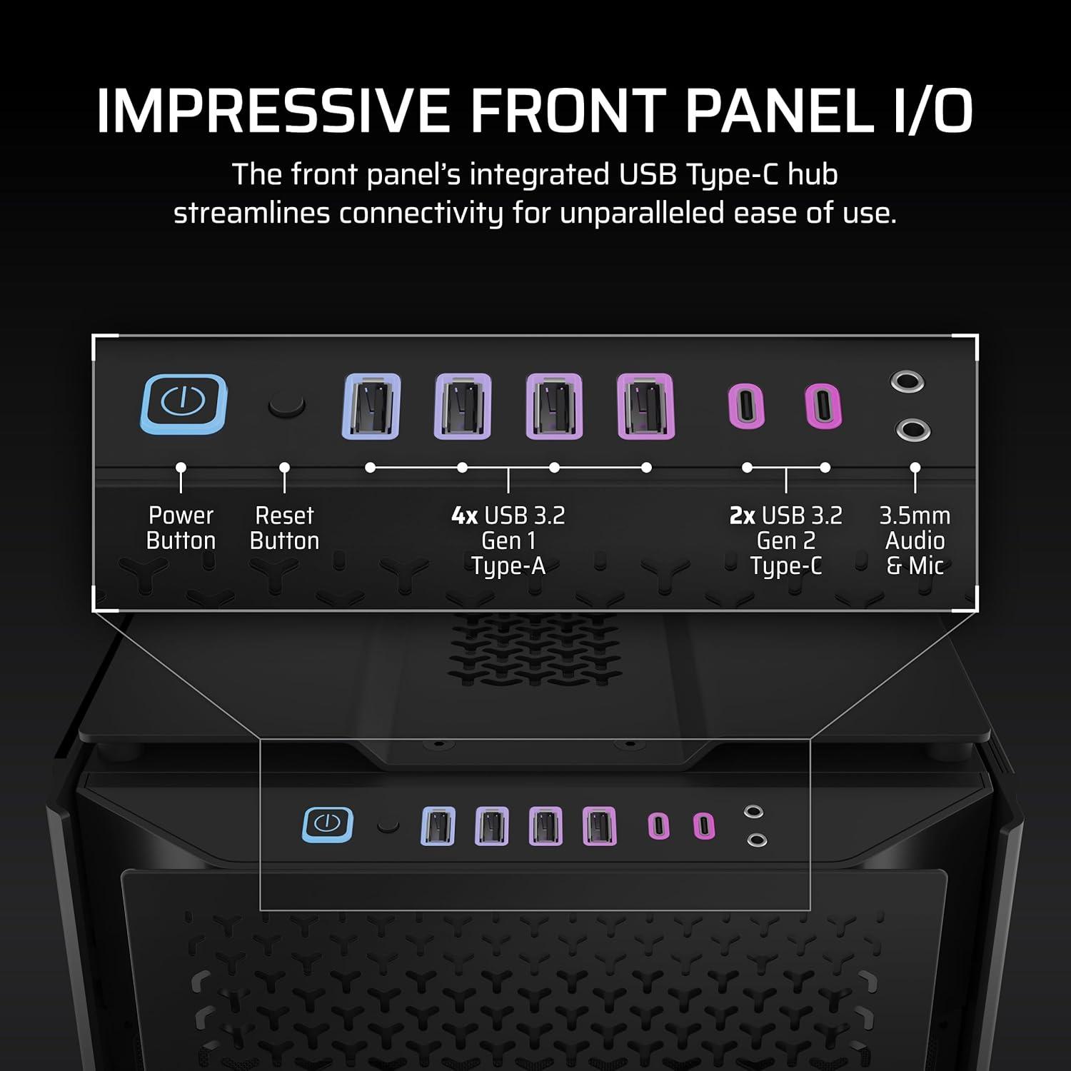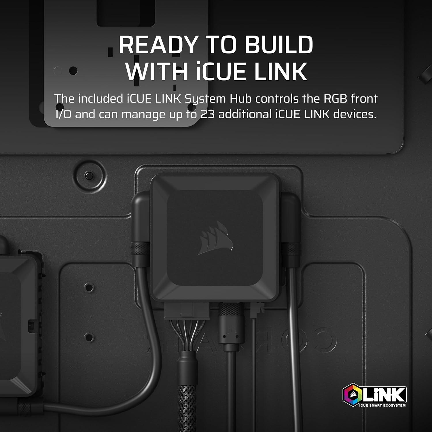 Ready to Build with iCUE LINK: An included iCUE LINK System Hub controls the RGB front I/O and is ready to expand your ecosystem by managing up to 13 additional iCUE LINK devices, ranging from fans and coolers to the premium Hydro X Series.