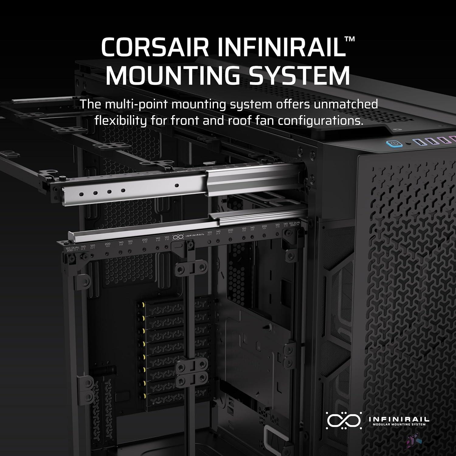 CORSAIR InfiniRail Fan Mounting System: This aluminum multi-point mounting system offers unmatched flexibility in front and roof fan configuration. Simply slide the rail to mount 120mm and 140mm fans wherever you like, ensuring targeted airflow without fixed vertical mounting constraints.