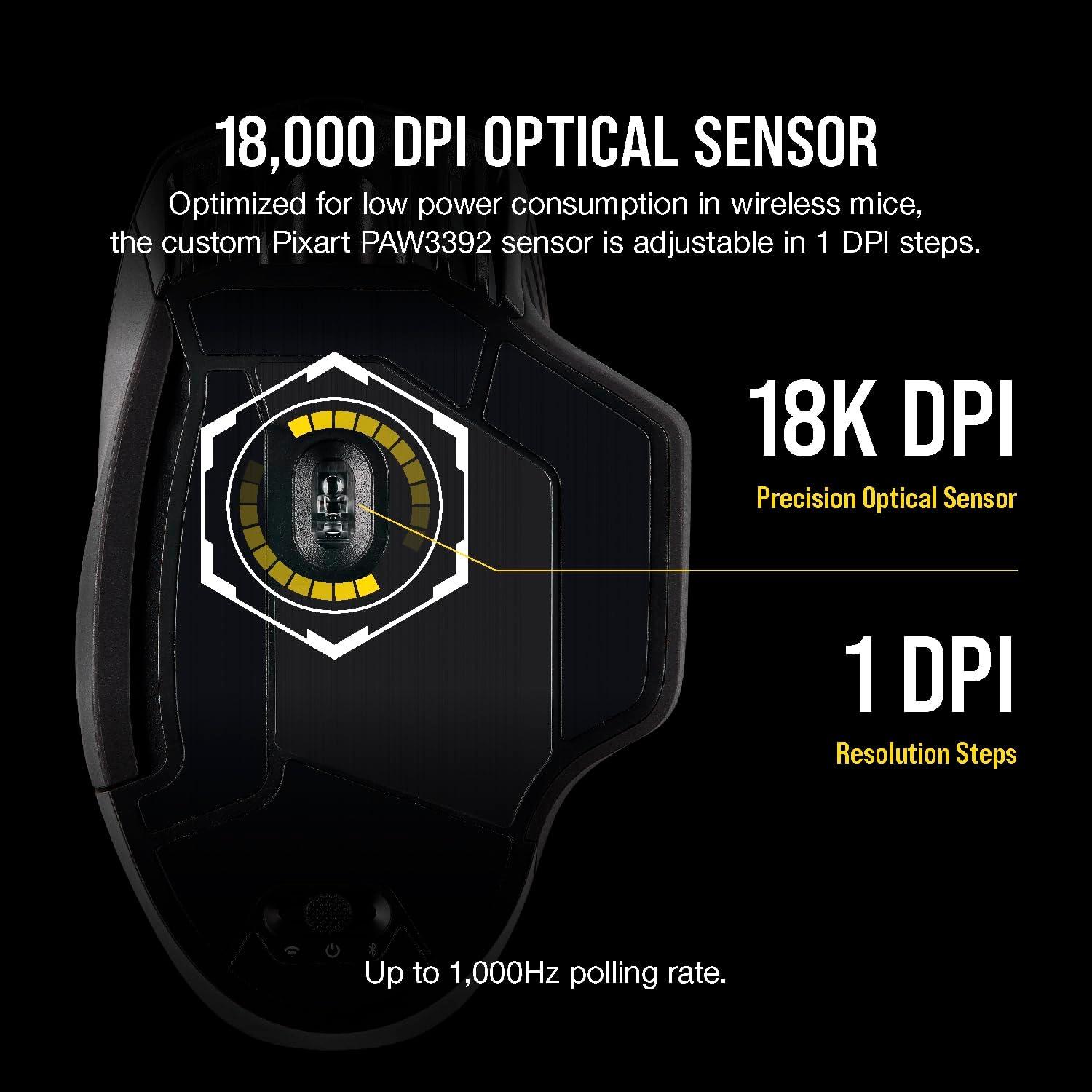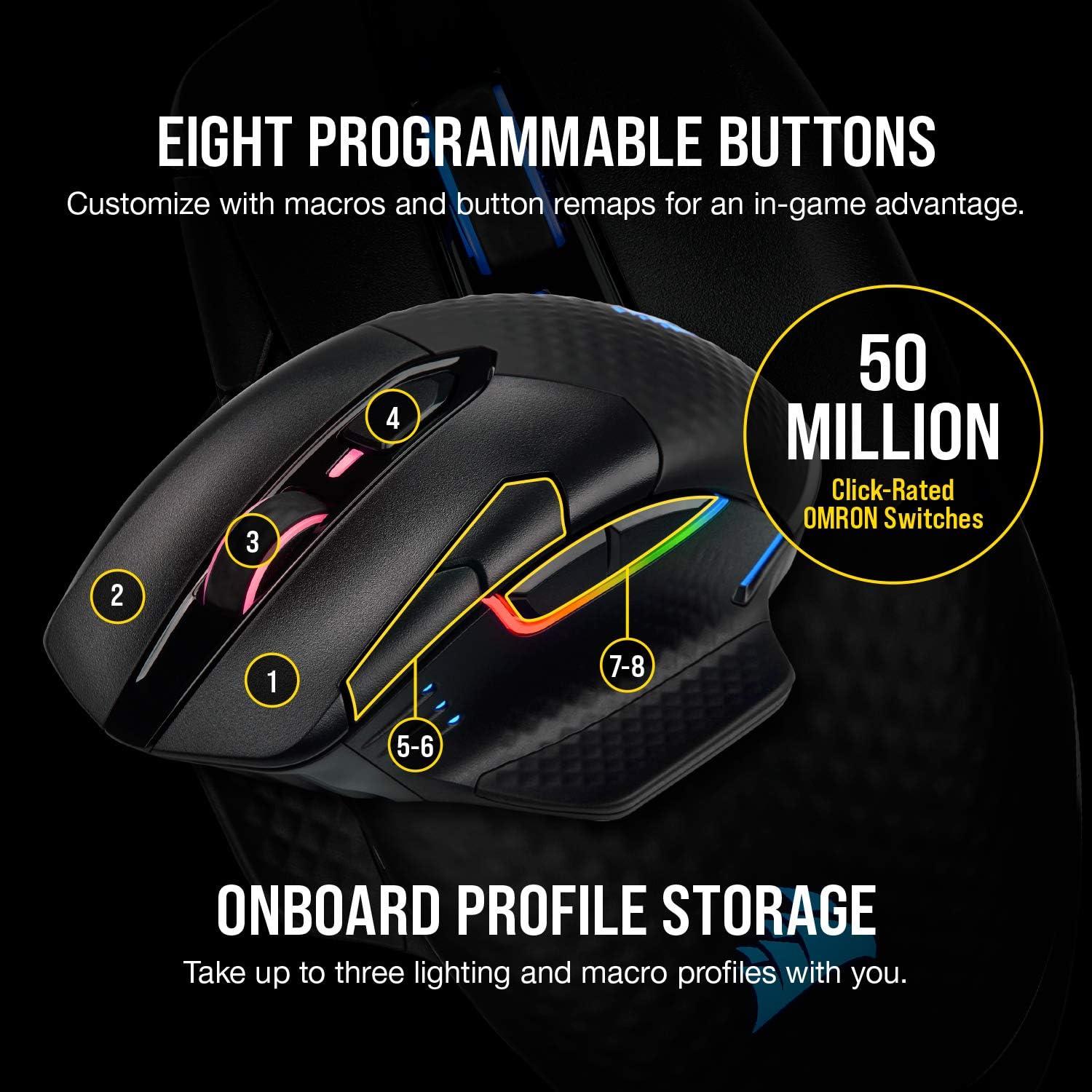 QI® WIRELESS CHARGING Charge wirelessly with any Qi-compatible charging device such as the CORSAIR MM1000 mouse pad. GET A GRIP Comfortable contoured shape with two included interchangeable side grips. DYNAMIC RGB BACKLIGHTING Nine-zone dynamic RGB backlighting, including an integrated light bar with four individually addressable RGB LEDs. PINPOINT ACCURACY & PRECISION Equipped with an 18,000 DPI custom PixArt PAW3392 optical sensor, optimized for wireless with extremely low power consumption, and customizable in 1 DPI resolution steps. Hyper-Polling Technology communicates with your PC at up to 2,000Hz, twice the speed of standard gaming mice. INTELLIGENT CONTROL. UNLIMITED POSSIBILITIES. CORSAIR iCUE software enables vivid dynamic RGB lighting control, sophisticated macro programming and full-system lighting synchronization across compatible CORSAIR peripherals, coolers, fans and more. Manufacturer: Corsair. Manufacturer Part Number: CH-9315511-NA. Brand Name: Corsair. Product Line: DARK CORE RGB PRO SE. Product Name: DARK CORE RGB PRO SE Wireless Gaming Mouse. Product Type: Gaming Mouse. [Pointing Device] Pointing Device Connectivity Technology: Cable/Wireless. Pointing Device Wireless Technology: Bluetooth/Radio Frequency. Wireless Operating Frequency: 2.40 GHz. Movement Detection: Optical. Movement Resolution (dpi): 18000. Total Number of Buttons: 8. [Interfaces/Ports] Pointing Device Host Interface: USB Type A. [Battery Information] Battery Included: Yes. [Physical Characteristics] Color Family: Black. Product Color: Black. Height: 1.7″. Width: 3.5″. Weight (Approximate): 5.01 oz. [Miscellaneous] Operating System Compatibility: Windows. Country of Origin: China. Environmentally Friendly: Yes. Environmental Compliance: China Restriction of Hazardous Substances (China RoHS). Waste Electrical and Electronic Equipment Directive (WEEE). Restriction of Hazardo