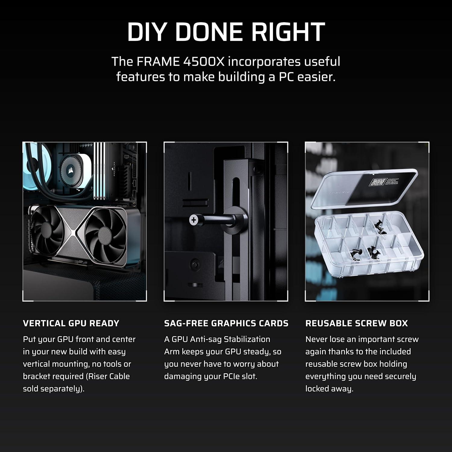 FRAME Modular Case System – The revolutionary FRAME system gives new meaning to the word customization. You can upgrade the motherboard tray, change the side-mounted fans to a cable cover, or swap out the PSU shroud to a form-fitting design with vertical GPU mounting points. It’s a case that can change and grow with your needs (or just your mood)