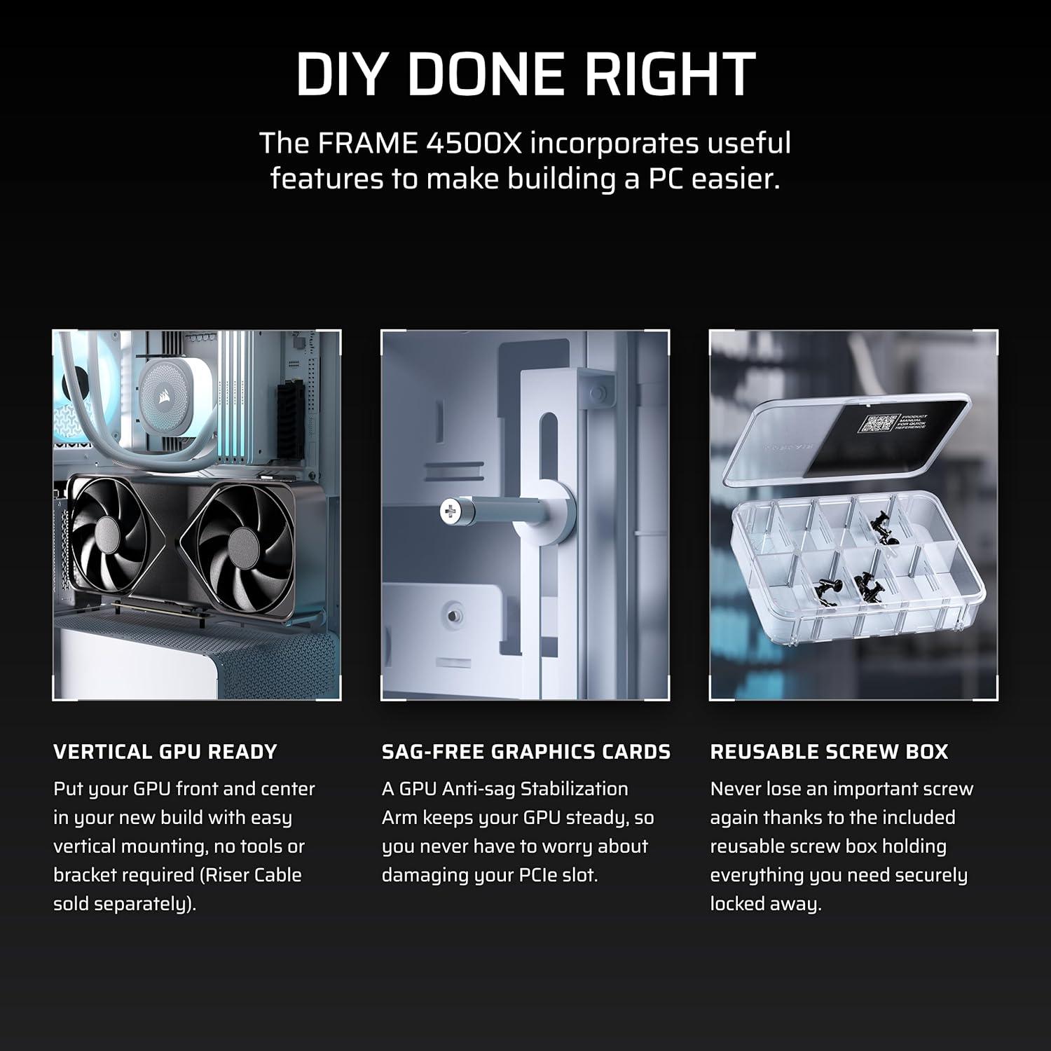 The CORSAIR FRAME 4500X is a mid-tower chassis that offers stunning visuals and high-performance features, all built on the customizable FRAME Modular Case System. Immaculate builds are achievable thanks to the single-piece wraparound glass panel and support for reverse-connector motherboards, while temps stay frosty with room for dual 360mm radiators and up to 10x 120mm fans or 5x 140mm fans using the InfiniRail fan-mounting system. The roomy interior is designed for oversized GPUs and includes an Anti-Sag arm, and reverse-rotor RGB fans complete the package. If your mood changes down the road, the case is customizable via the modular FRAME system, so it’s also future-proof. Tech Specs Dimensions (mm): 499 x 256 x 471 mm Material: Steel, Tempered Glass, Plastic Cooling Layout: Front: None, Top: 3x 120mm, 2x 140mm, Side: 3x 120mm, 2x 140mm (3x LX120R RGB LINK Fans Included), PSU Shroud: 2x 120mm, Bottom: 1x 120mm, Rear: 1x 120mm, 1x 140mm Radiator Compatibility: Front: None, Top: 360mm, 280mm, 240mm, Side: 360mm, 280mm, 240mm, Bottom: None, PSU Shroud: None, Rear: 120mm, 140mm Expansion Slots (Main): 8 Horizontal or 3 Vertical Motherboard (Main): Mini-ITX, Micro-ATX, ATX, E-ATX (305mm x 277mm) Storage: 2x 2.5″ SSDs, 1x 3.5″ HDDs Clearances: PSU: 250mm, CPU Cooler: 185mm, GPU: 460mm Dust Filters: Bottom, Right Side Front I/O: USB 3.2 Gen1 Type-A (x2), USB 3.2 Gen2 Type-C (x1), Headphone/Microphone (x1), Power Power Supply Compatibility: ATX Box Contents: FRAME 4500X Case, 3x LX120R RGB LINK Fans, Case Accessory Box