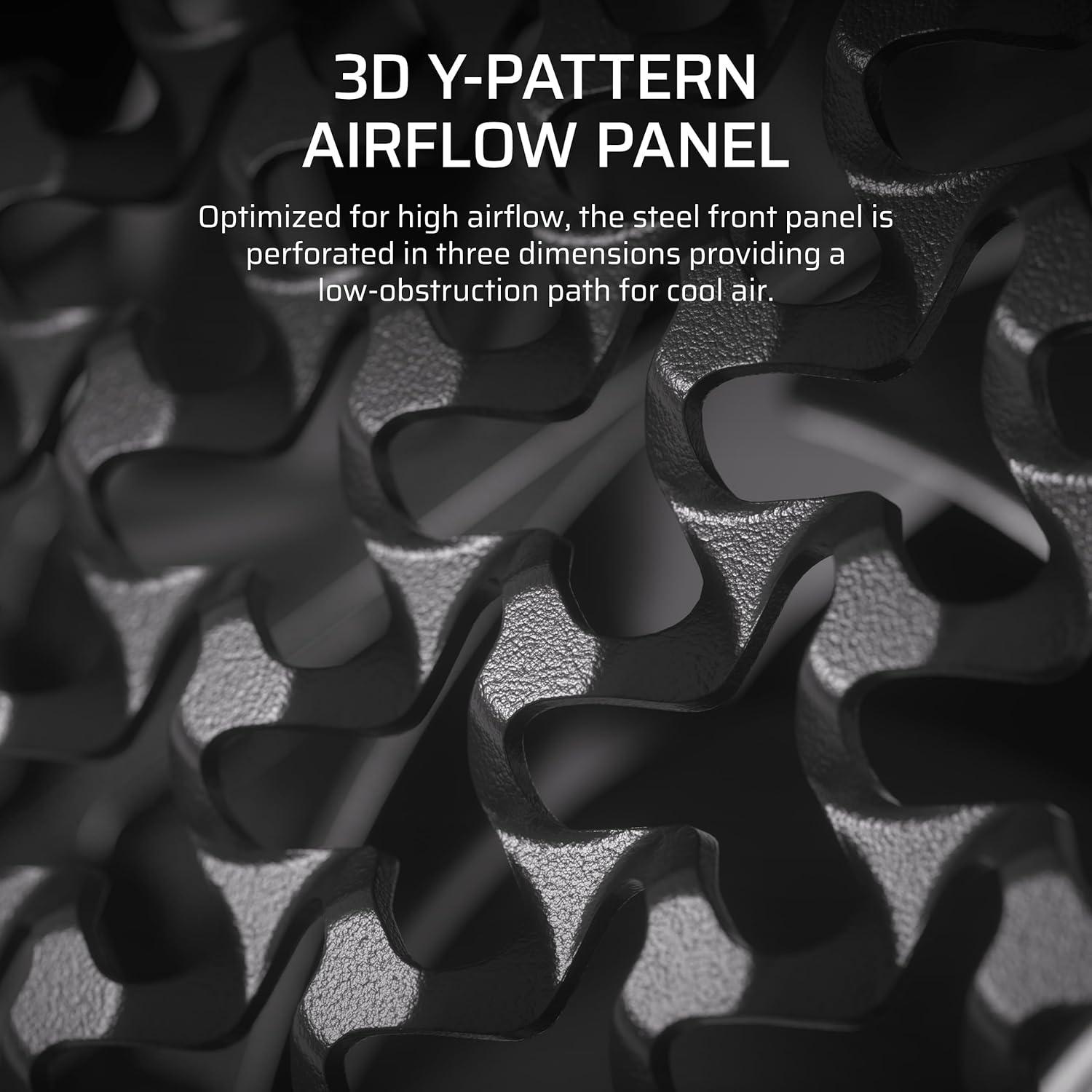 3D Y-Pattern Airflow Panel – Optimized for high airflow and minimal restriction, the steel front panel is perforated in three dimensions with a Y-pattern that provides a low-obstruction path for cool air.