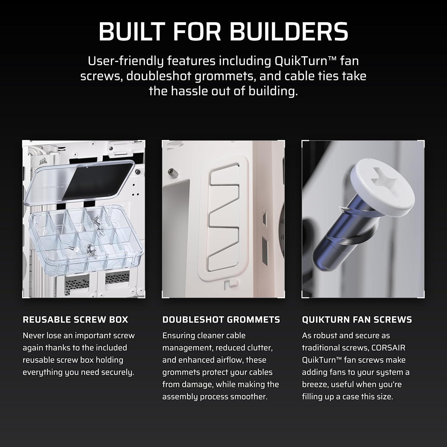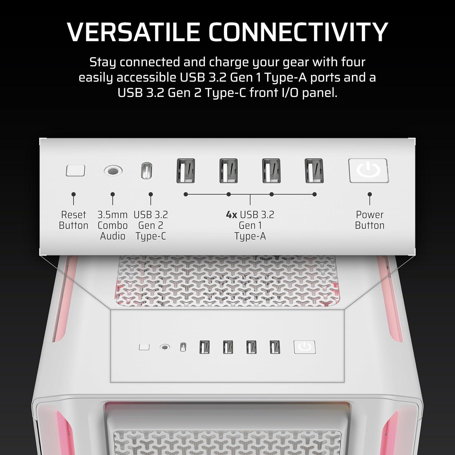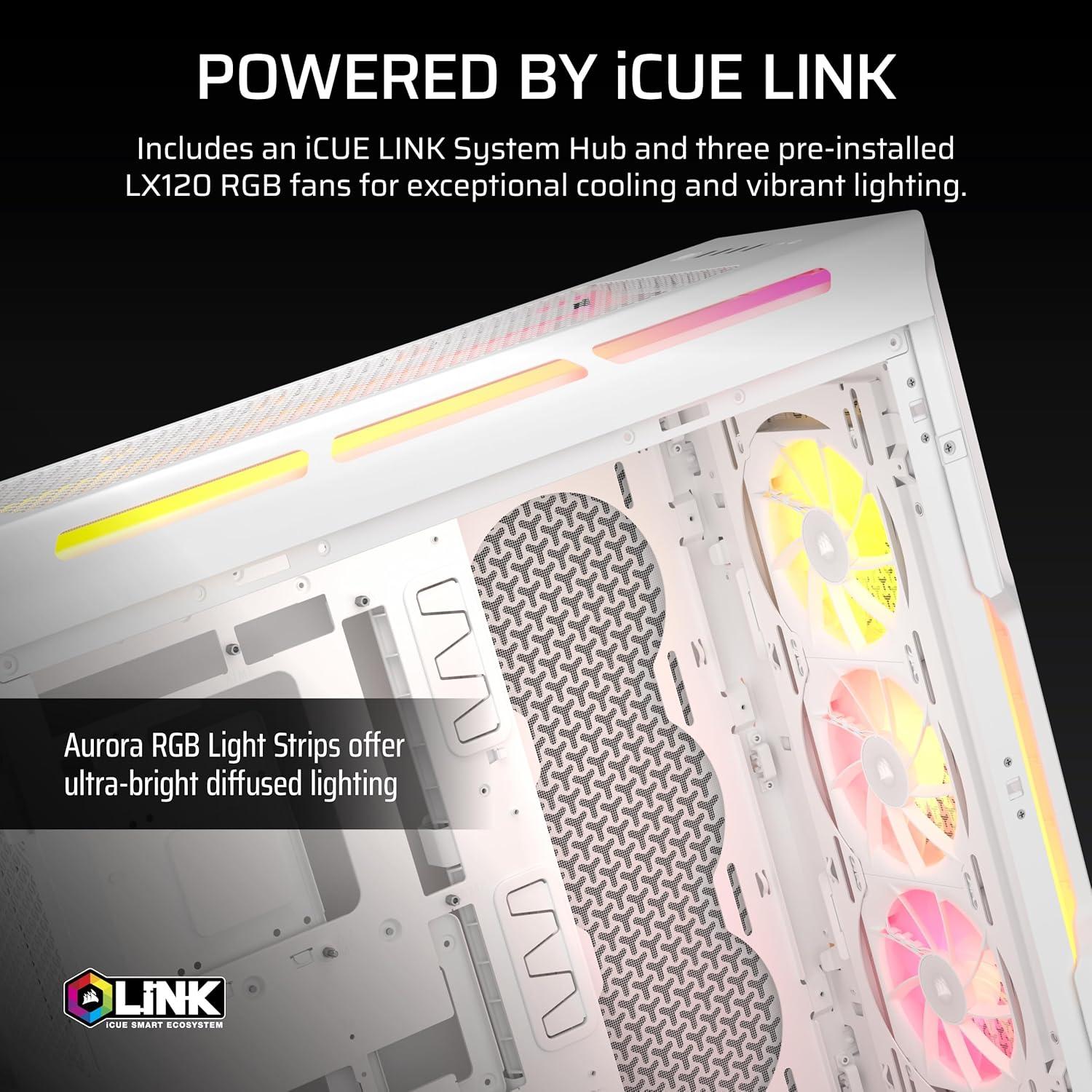 iCUE LINK LX120 RGB Fans – Your iCUE LINK-powered system starts with an included System Hub and three pre-installed LX120 RGB fans for excellent cooling and vibrant lighting