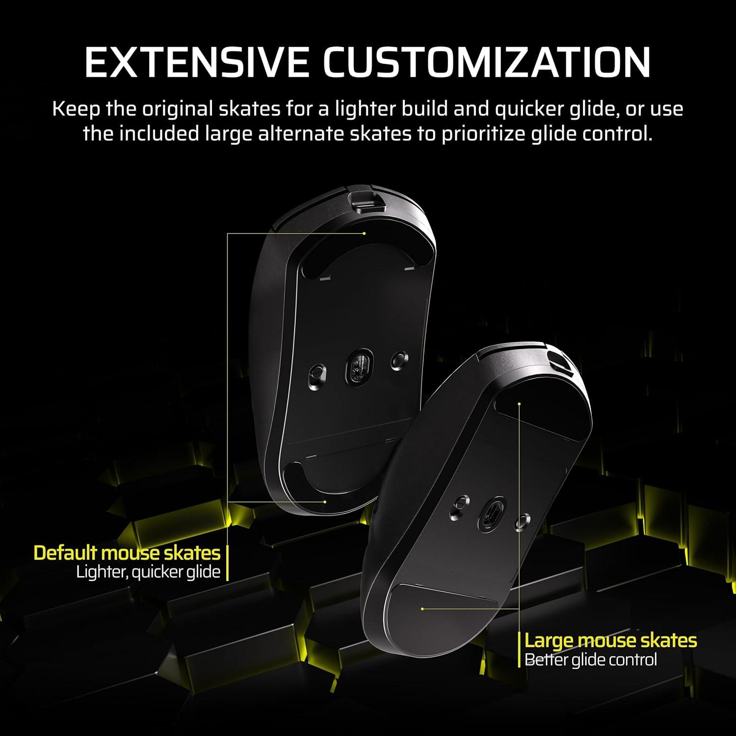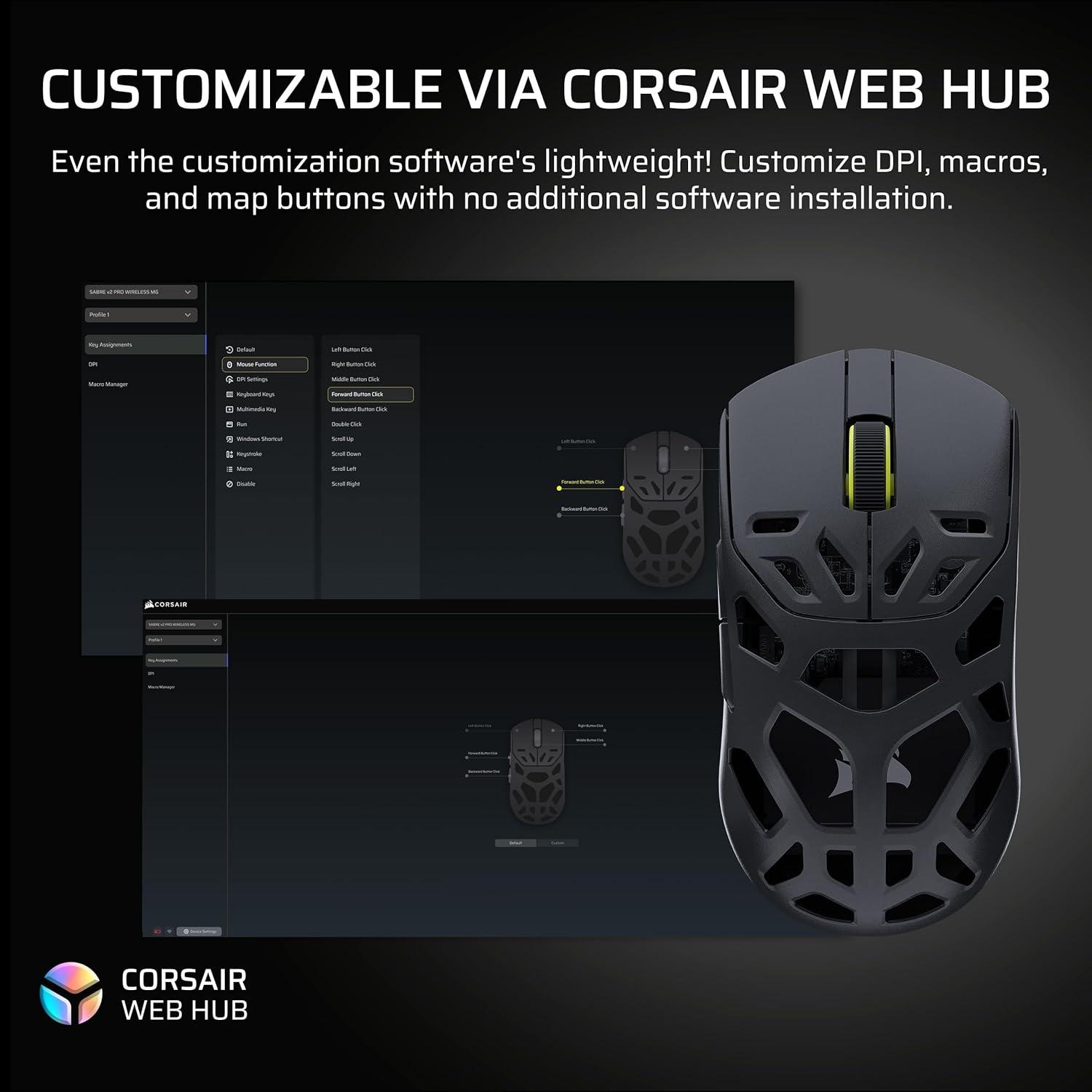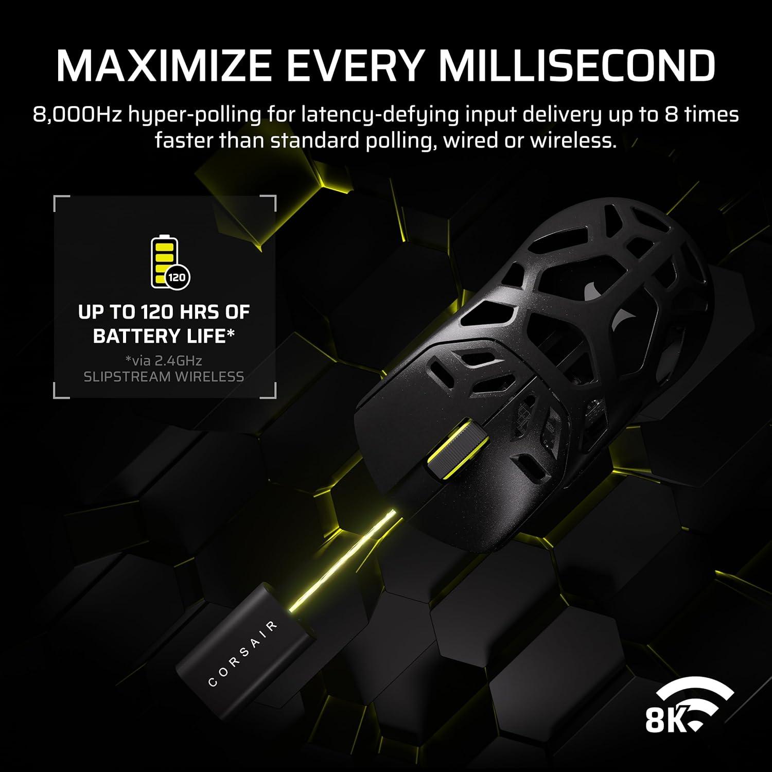 Get pro-level performance with the CORSAIR SABRE v2 PRO Wireless MG Gaming Mouse. Purpose-built for elite FPS players who expect exceptional precision but also want the cooling benefits and strength of a magnesium alloy shell. With its 8,000Hz hyper-polling and CORSAIR MARKSMAN S 33,000 DPI sensor, SABRE v2 PRO delivers latency-defying responsiveness and pixel-perfect control. The light weight, symmetrical shape, and up to 120 hours of 2.4GHz wireless freedom provide comfort and endurance to grind through competitive sessions. Customize it with the included additional grip tape, replacement skates, and lightweight, web-based CORSAIR Web Hub. Built Beyond.