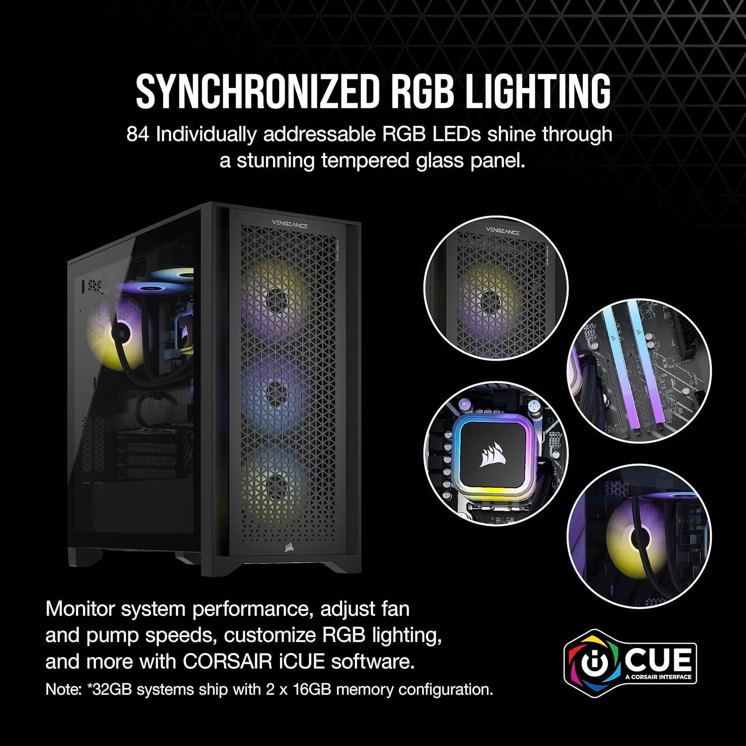 Step up your game with a CORSAIR VENGEANCE a7400 Series Gaming PC, powered by an AMD Ryzen 9000 Series CPU, NVIDIA GeForce RTX 40 Series graphics, and CORSAIR VENGEANCE RGB DDR5 Memory. Dynamic RGB lighting brilliantly illuminates the system, with powerful CORSAIR iCUE software to control lighting, fan and pump speeds, and more. The VENGEANCE a7400 Series is cooled by an H60x RGB ELITE liquid CPU cooler and six SP RGB ELITE fans with AirGuide technology for concentrated airflow. Equipped with a high-speed M.2 NVMe SSD, housed in a roomy CORSAIR 4000D AIRFLOW mid-tower case, and easily upgradeable thanks to a standard ATX form-factor, this is everything you need to game with a VENGEANCE.